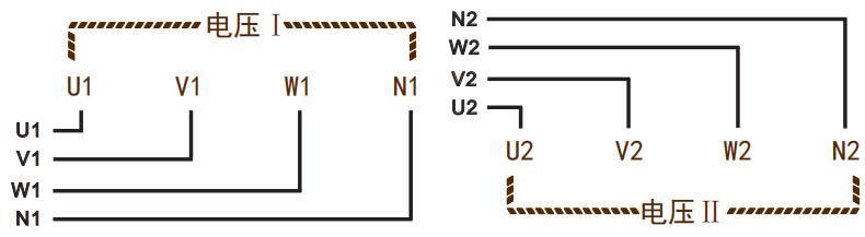 監(jiān)測(cè)電壓輸入:電壓I和電壓Ⅱ:兩路獨(dú)立的三相四線電壓輸入;并接在被監(jiān)測(cè)電壓上,注意U、V、W、N線的順序及極性。